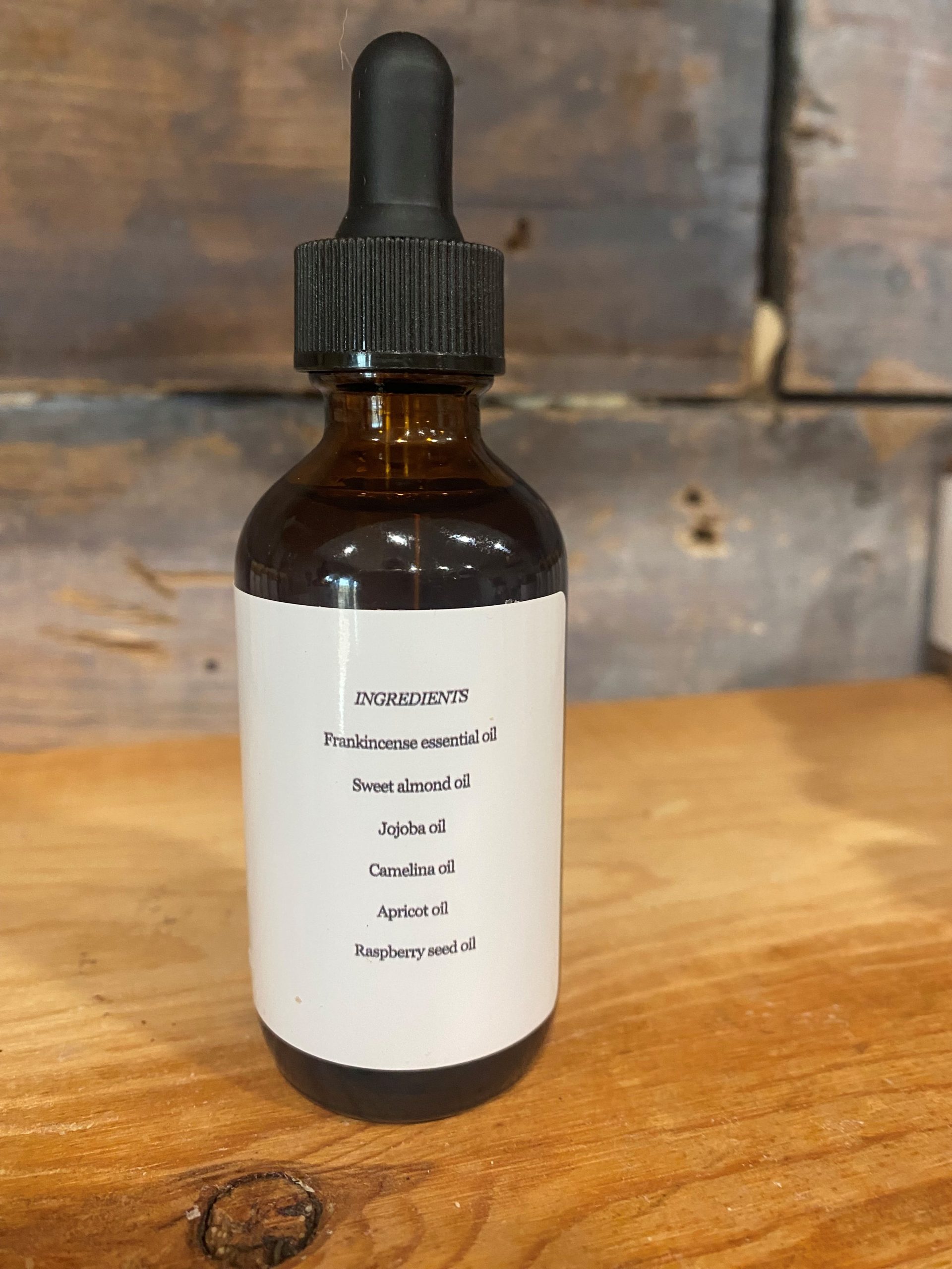 Ingredients: Frankincense essential oil, Sweet almond oil, Jojoba oil, Camelina oil, Apricot oil, and Raspberry seed oil